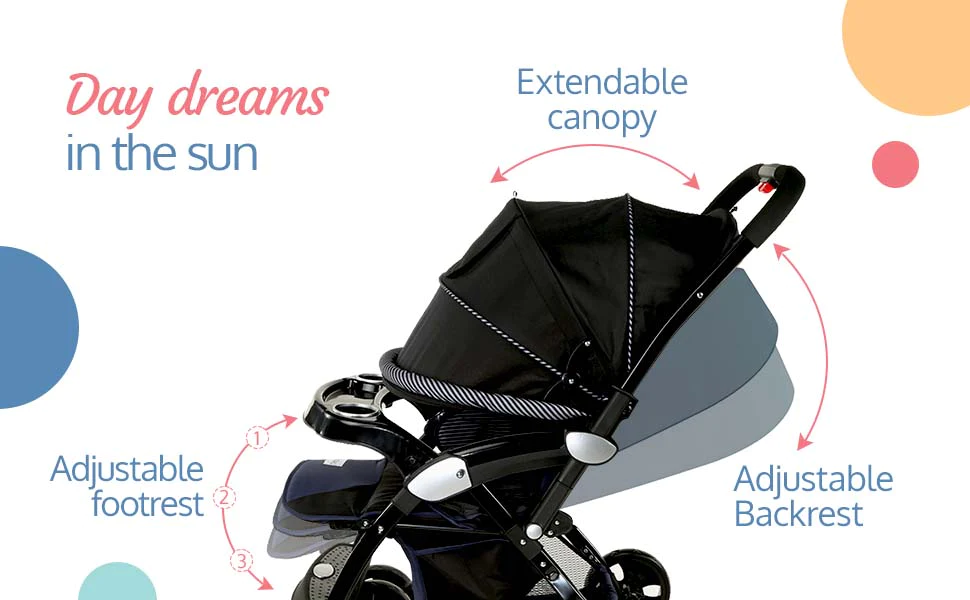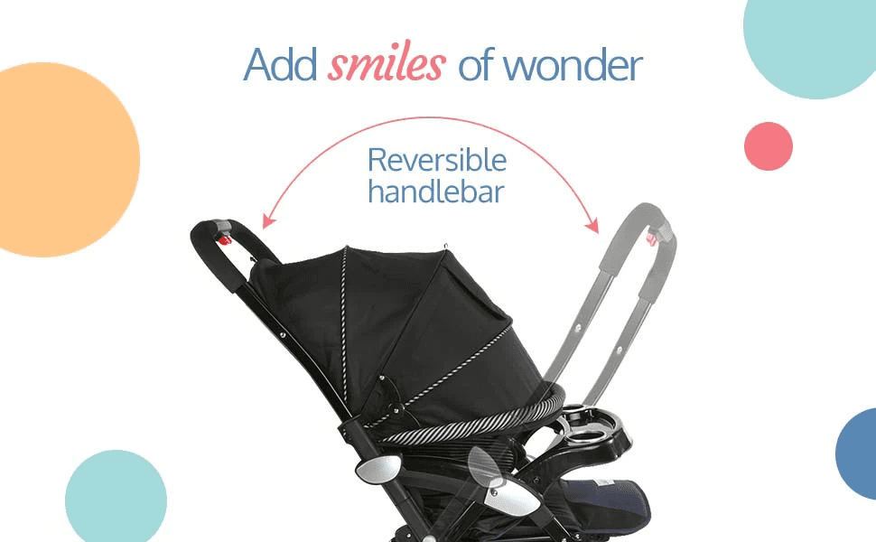 - Extra spacious stroller with heavy duty wheels—the best choice for outdoor use.It comes with Reversible handle bar that helps mom stroll facing baby.