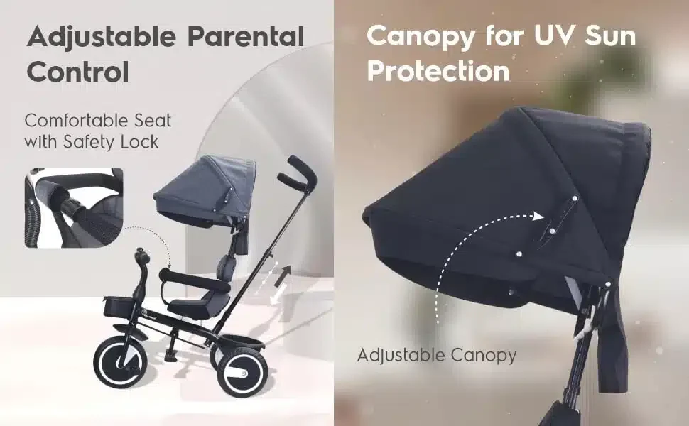 - Adjustable Parental Control with Canopy: Steer them safely using parental control to ensure safe rides and protect them from dirt and harsh sunlight by pulling down the canopy.
